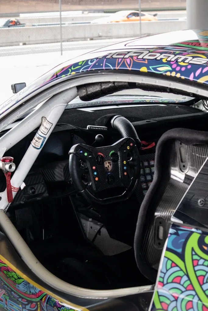 The Porsche GT3 track car interior is a driver-focused cockpit designed for optimal performance. Clad in premium materials, it features lightweight racing seats, a purposeful steering wheel, and a streamlined dashboard with intuitive controls. Carbon fiber accents and racing-inspired details enhance the sporty atmosphere, while advanced technology integrates seamlessly for a connected driving experience. The interior of the GT3 track car embodies a perfect balance of comfort and functionality, emphasizing the car’s track-ready nature.