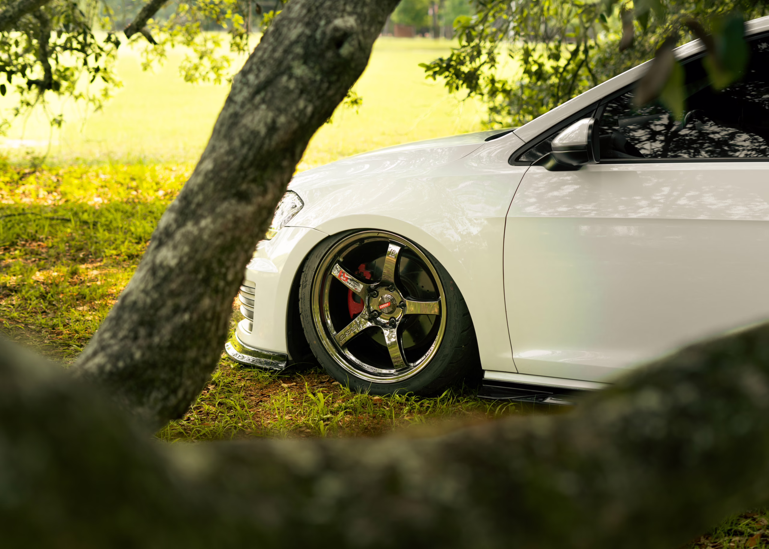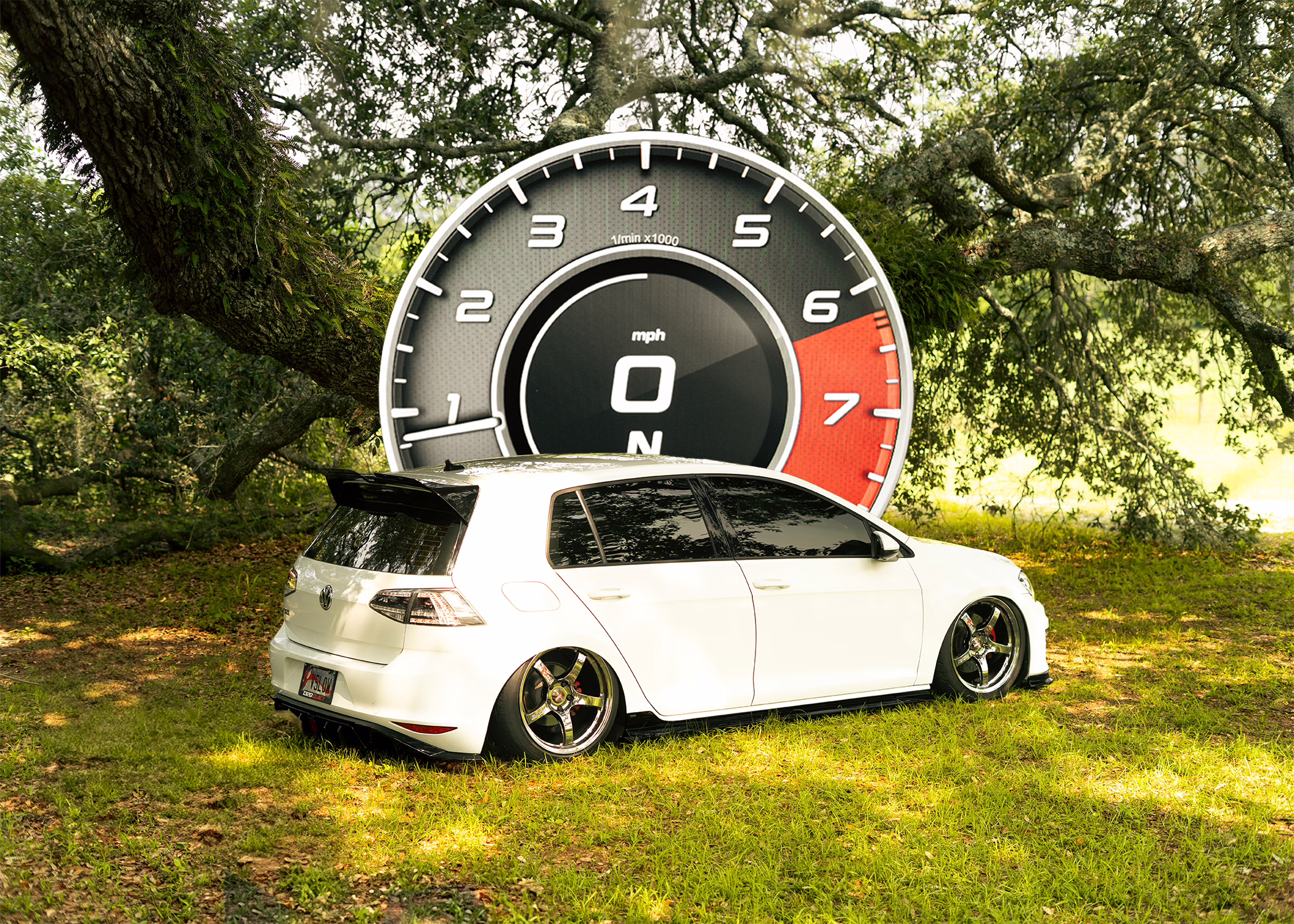 The GTI has also undergone an exterior makeover. Up front, Chris added an ECS front lip as well as BMP Illuminator headlights and sequential mirror turn signals. On the sides he added ZAERO side skirts. The rear includes an Oettinger spoiler, K2 Industries clear taillights, and a K2 Industries rear diffuser. Now, most importantly, Chris’s GTI suspension setup consists of Raceland bags, with Airlift 3p air management. It is sitting on 18-inch Rays Gram Lights 57CR wheels in black chrome.