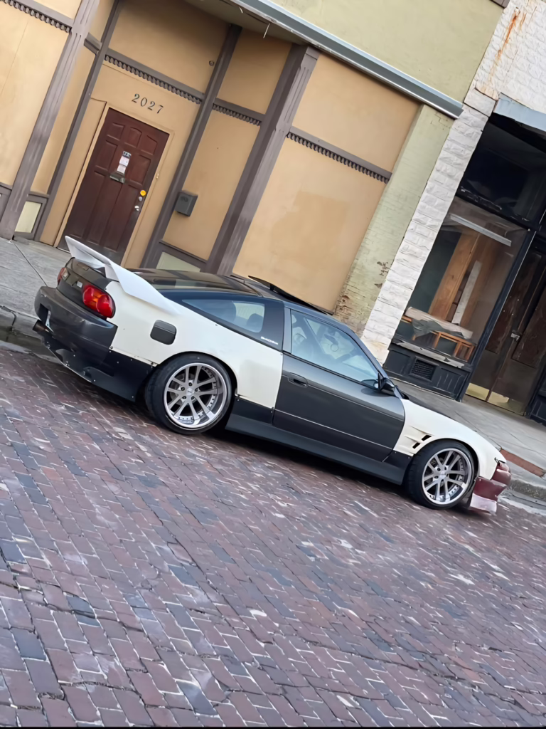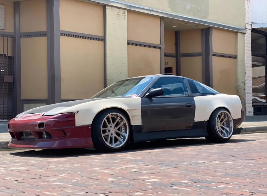 Beyond the powertrain and suspension, Hussey’s 240SX carries a long list of thoughtful upgrades that define both its look and feel. The exterior features Origin Type 3 front fenders and rear over-fenders, paired with an M-Sports hood and a full suite of Modelo Drive components, including the front bumper, side skirts, rear wing, roof wing, and headlight pockets. GK Tech mirrors add a sharper profile, while Weds LXZ wheels complete the stance. Lighting has been updated with Diode Dynamics driving lamps and classic 180SX taillights, tying modern function to timeless styling cues. Inside, the car balances purpose and detail with Thrash Racing seats on Planted brackets, a Nardi steering wheel with P2M quick release, and a mix of custom carbon fiber overlays and suede touches. Together, these elements transform the S13 into a car that feels both refined and distinctly personal.