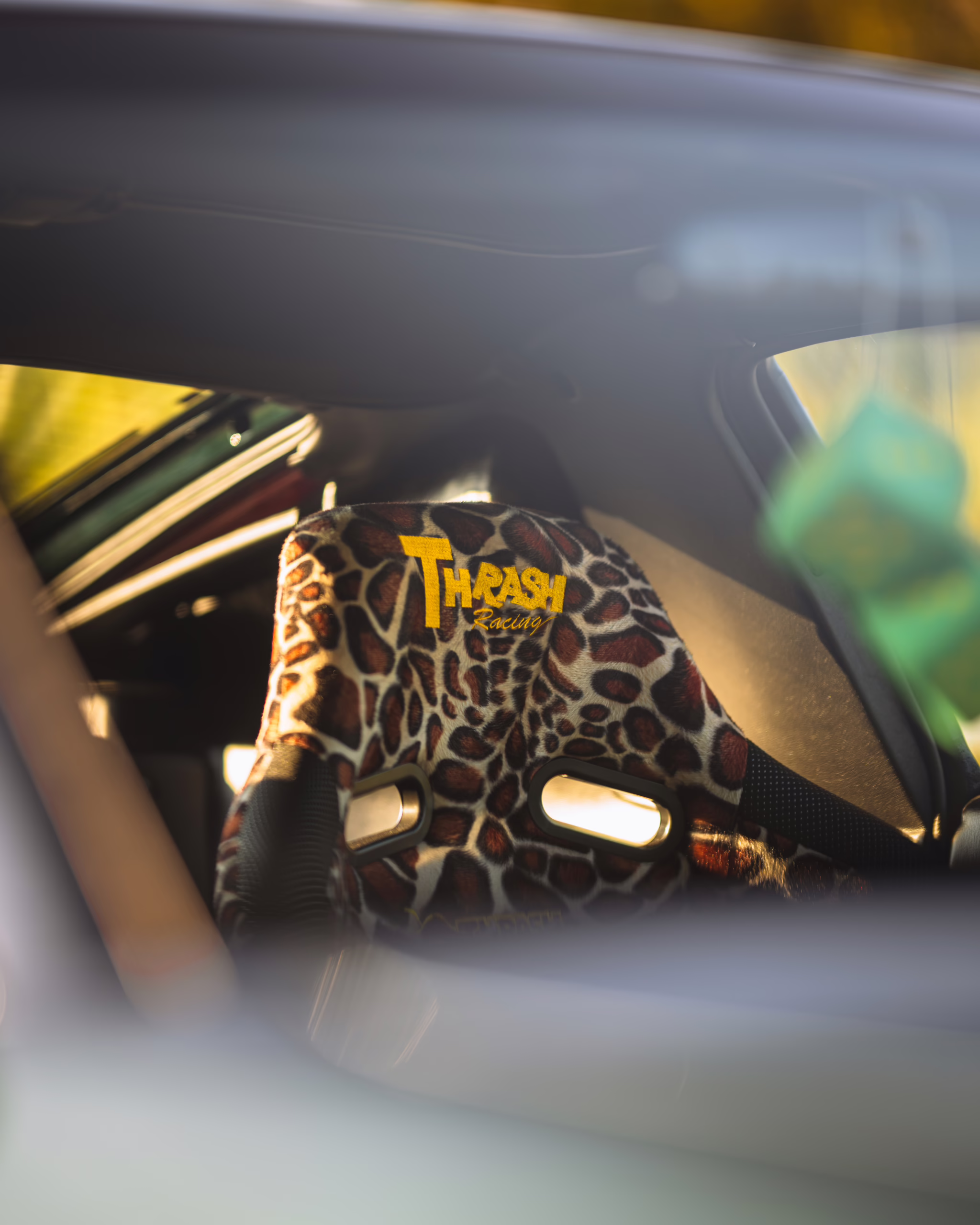 The interior of the 240SX blends function with subtle customization. Thrash Racing seats sit on Planted brackets, paired with a Nardi steering wheel and P2M quick release hub. A hand-made horn button from Smartkrew adds a personal touch, while carbon fiber overlays fabricated in-house refine the trim. The rear seat delete is supplied by LRB Speed, and the headliner was reworked in suede by Mike Reedy.