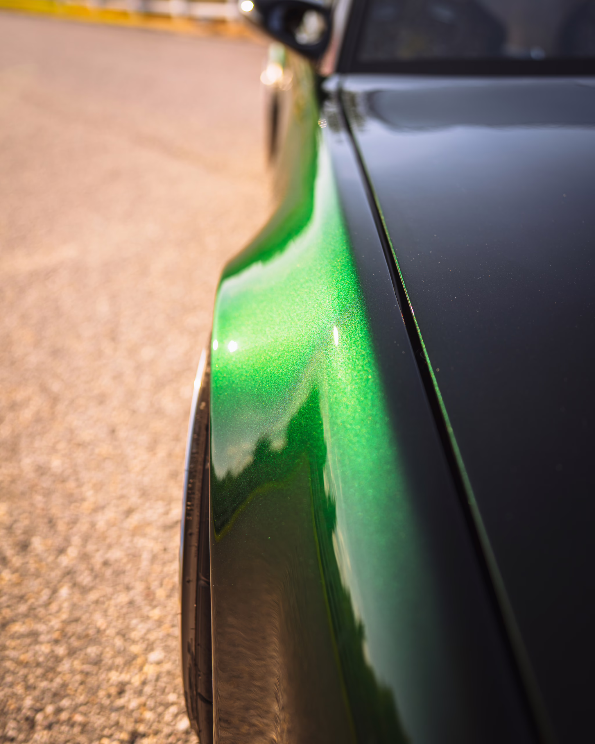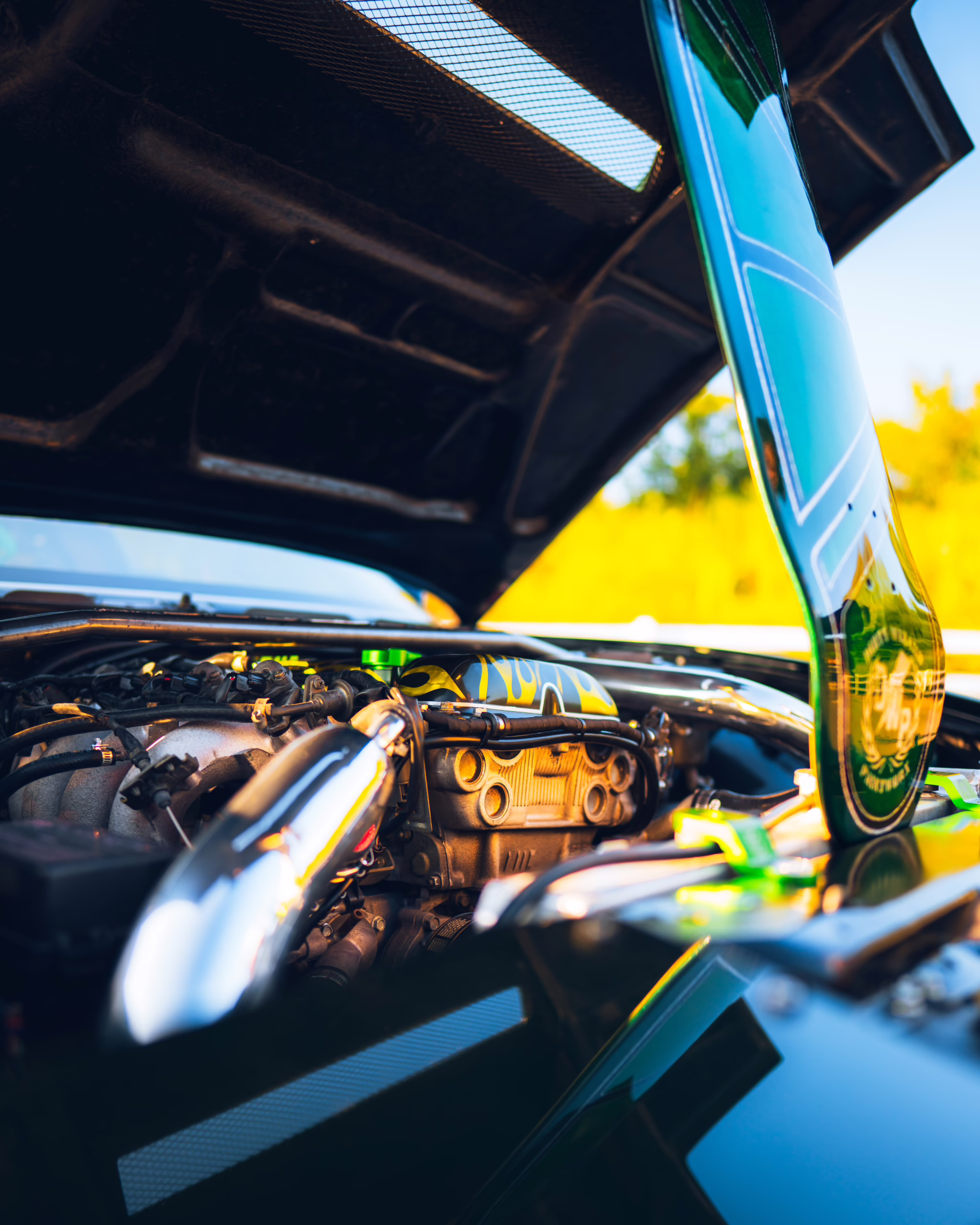 The paint choice came from Michael’s wife, Kelly, and brother Matt: Tropical Glitz “Luscious Green”, accented with Tropical Glitz “Cosmic Black” on the roof and sides. Custom touches followed: handmade quarter panel glass, fiberglass aero pieces, a rebuilt OEM sunroof, and a bespoke interior featuring carbon overlays and black suede. Every detail spoke to the vision of creating something personal, something one of a kind.