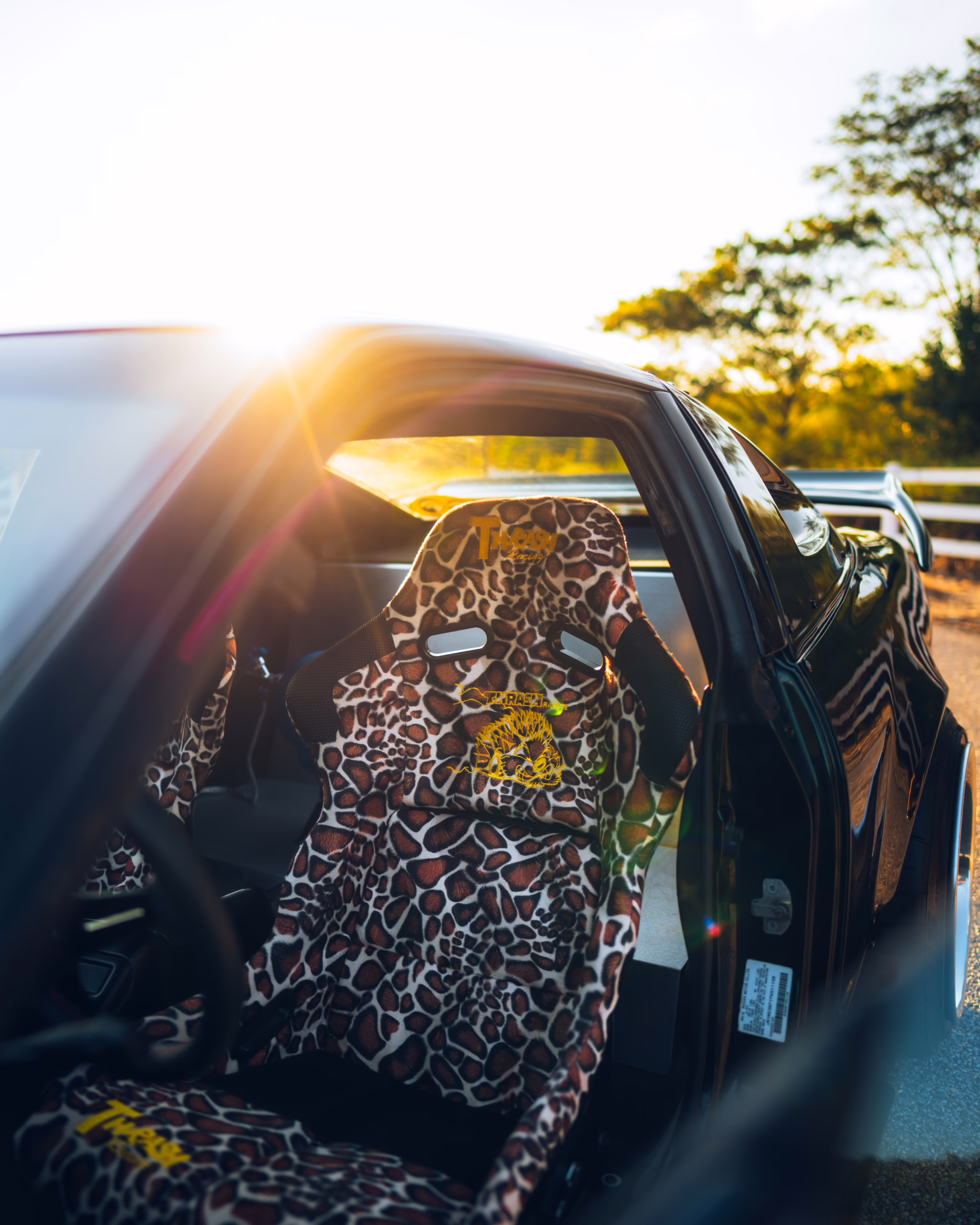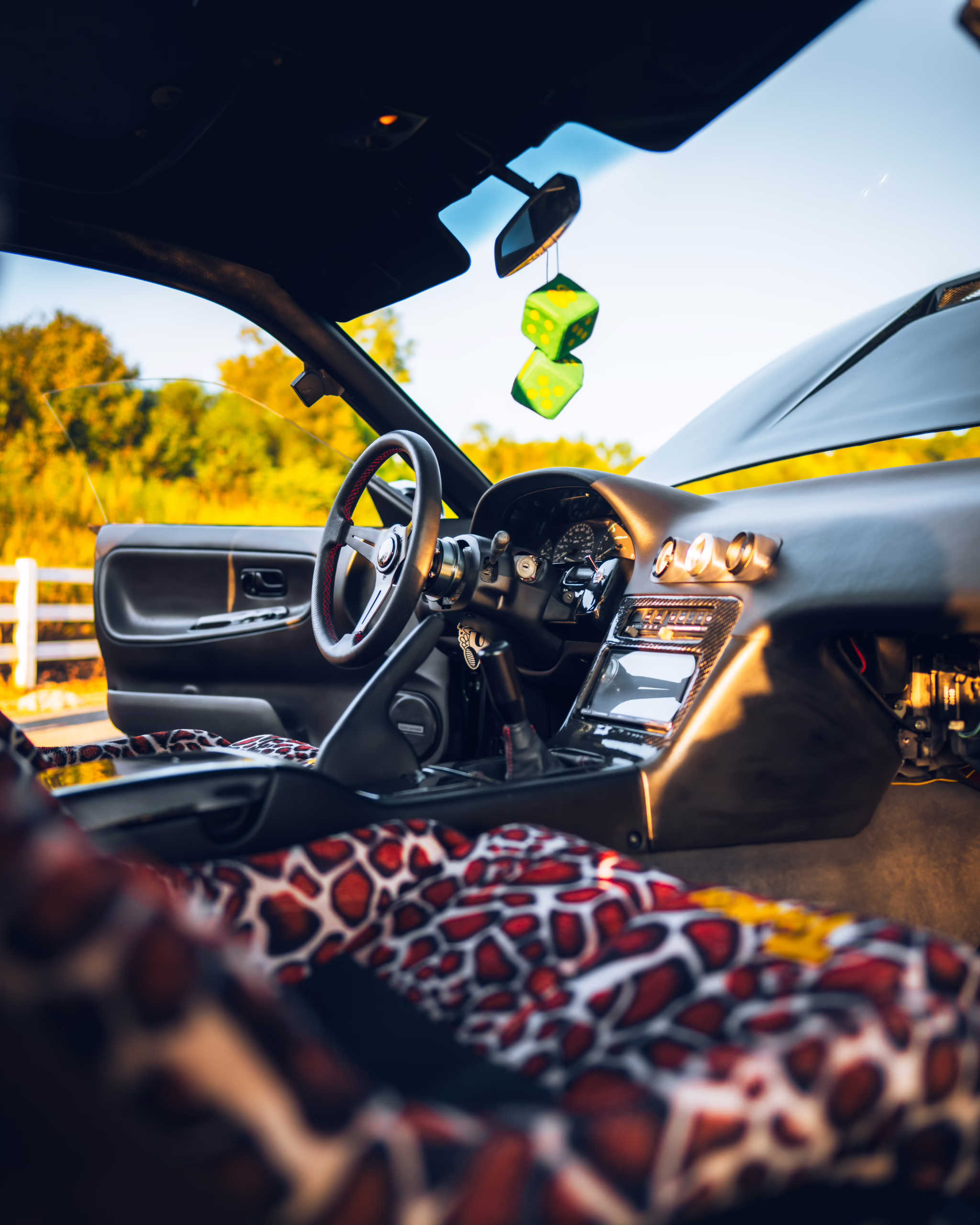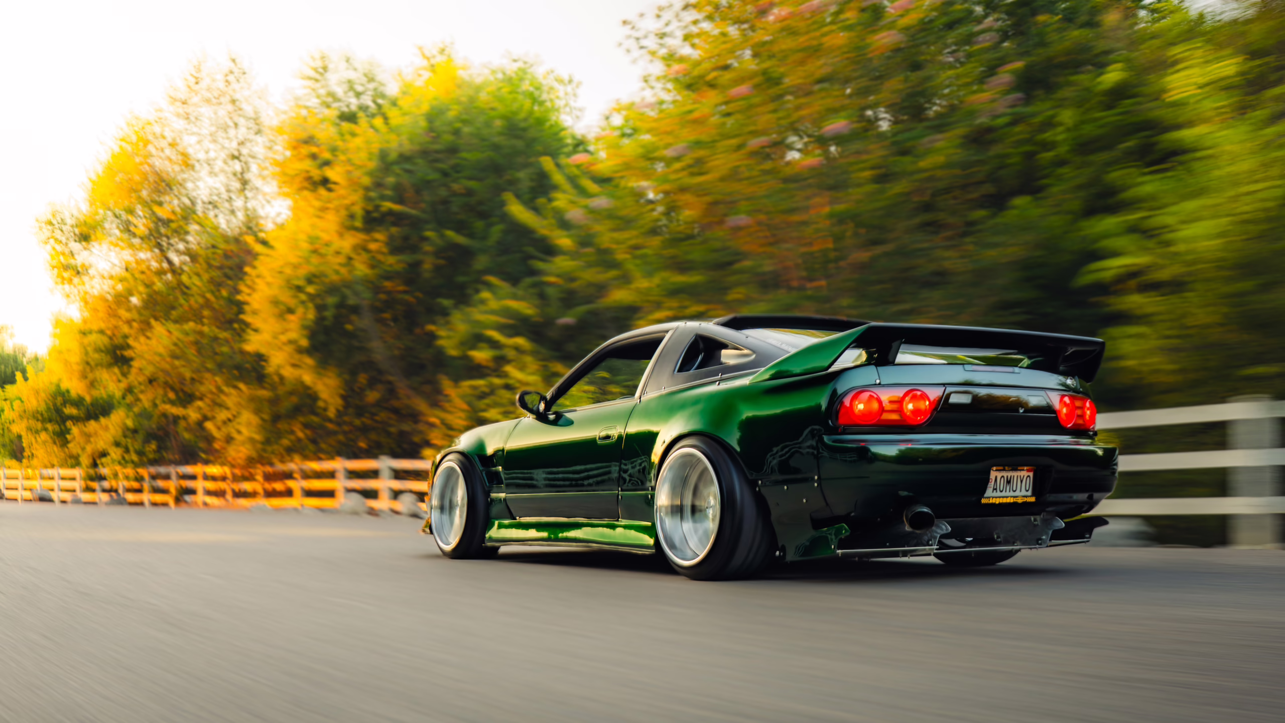 Beyond the powertrain and suspension, Hussey’s 240SX carries a long list of thoughtful upgrades that define both its look and feel. The exterior features Origin Type 3 front fenders and rear over-fenders, paired with an M-Sports hood and a full suite of Modelo Drive components, including the front bumper, side skirts, rear wing, roof wing, and headlight pockets. GK Tech mirrors add a sharper profile, while Weds LXZ wheels complete the stance. Lighting has been updated with Diode Dynamics driving lamps and classic 180SX taillights, tying modern function to timeless styling cues. Inside, the car balances purpose and detail with Thrash Racing seats on Planted brackets, a Nardi steering wheel with P2M quick release, and a mix of custom carbon fiber overlays and suede touches. Together, these elements transform the S13 into a car that feels both refined and distinctly personal.