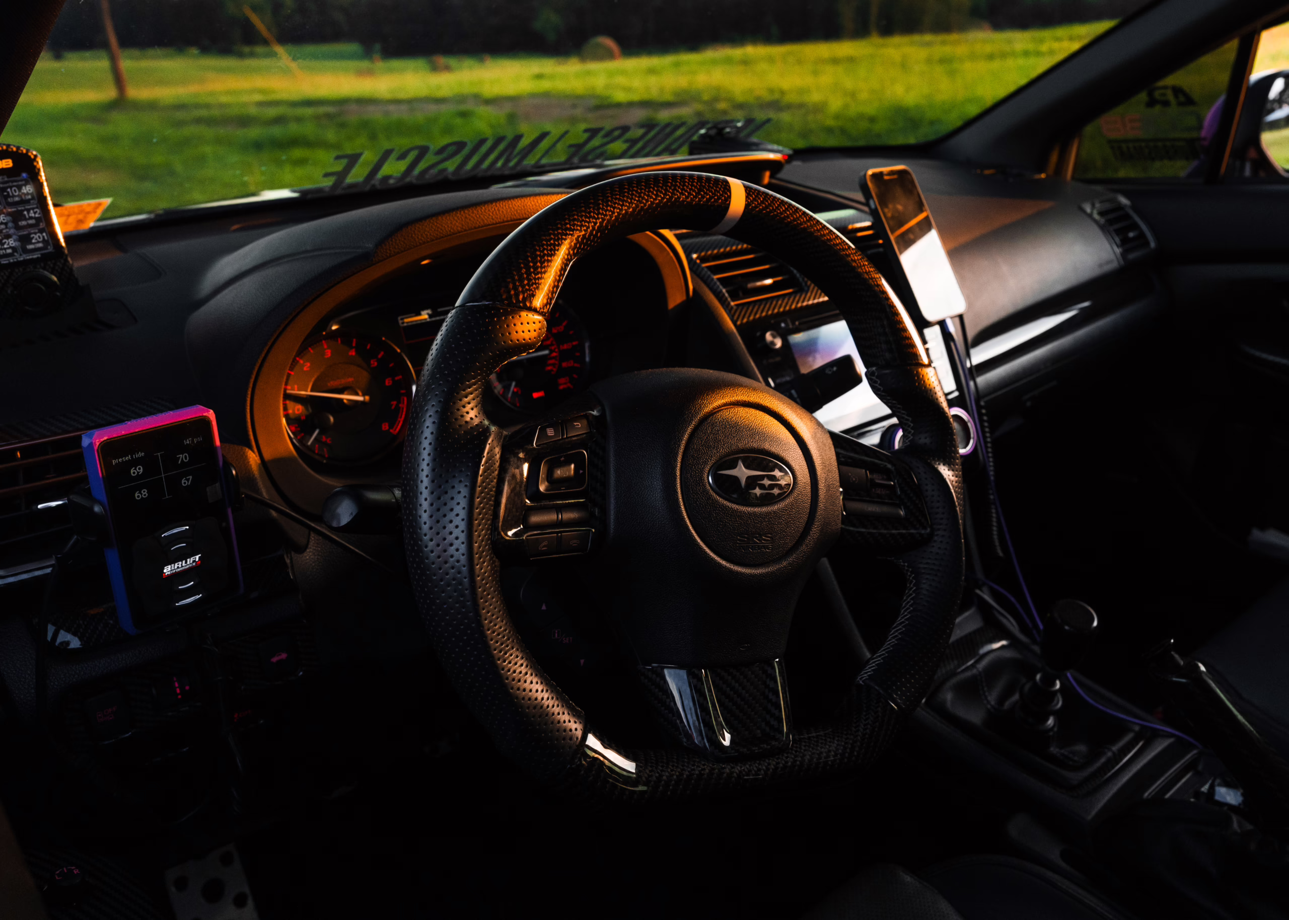 Jonathan’s WRX interior upgrades complement the car’s performance focus while adding some nice carbon fiber touches. The cabin features a carbon fiber flat-bottom steering wheel wrapped in leather, enhanced with OLM S-Line carbon fiber steering wheel covers for style and grip. Shifting precision is improved with a Shift Solutions black carbon fiber 6-speed shift knob, a Boomba Racing billet short-throw shifter lever, and a Boomba short shift transmission plate. These interior modifications really help bring the whole car together as well as improve driving experience.