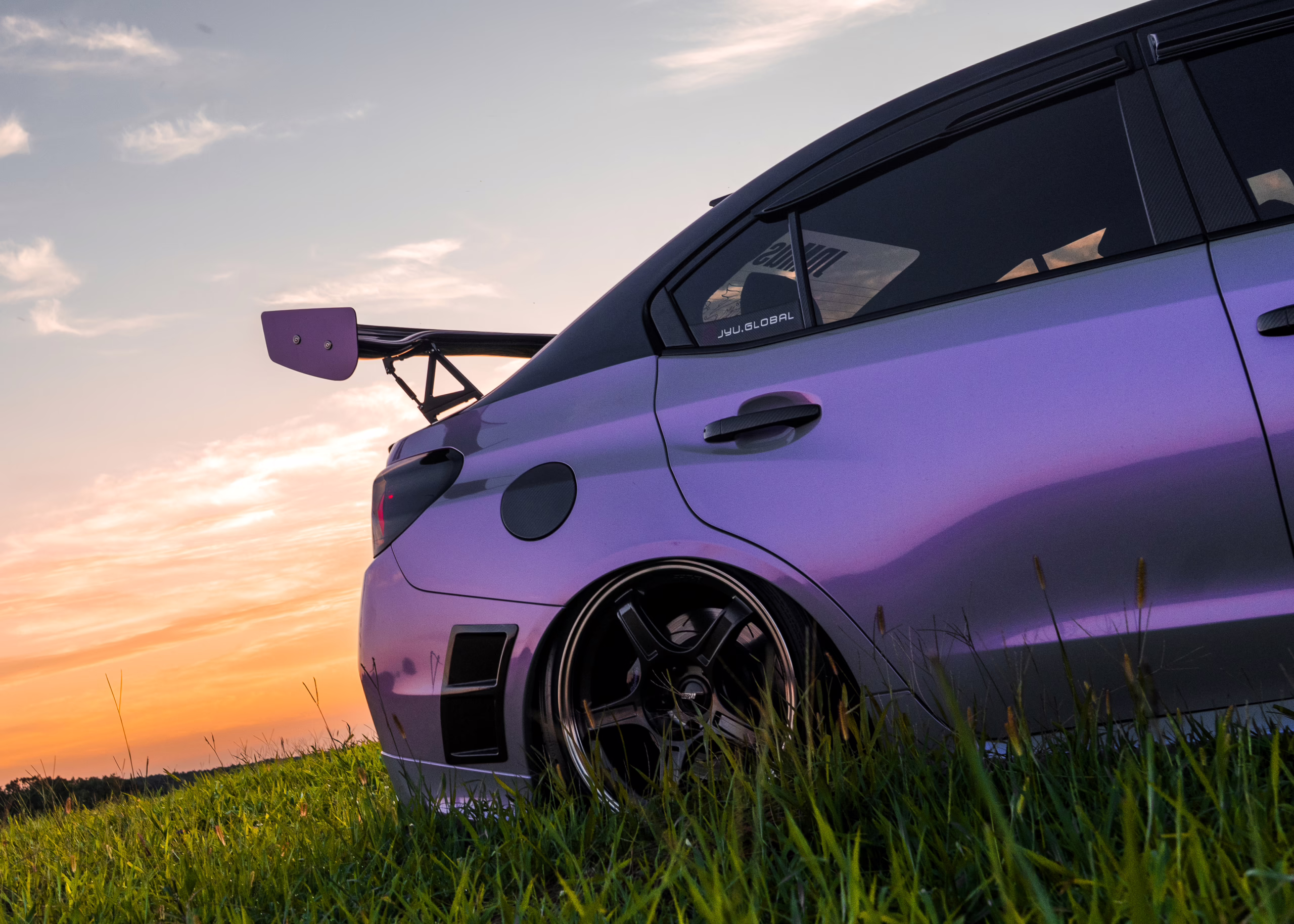 Now, for what we see, the exterior. The most obvious parts of this carinclude Jonathan’s VinylFrog wrap, Candy Metallic Gray Purple, as well as his very low stance from his Airlift 3p air suspension setup. Also featuring a JDMuscle Tanso Carbon Fiber Hood V3 (scoopless for FMIC), Subaru WRX CS V2 carbon fiber side skirts, APR Carbon Canard set, OLM S-Line door trim, full mirror covers, and an upper front bumper cover, which is complemented by a D-Style trunk spoiler wing, APR GTC-200 rear wing spoiler with Gurney flap, carbon rear bumper vents, rear roof spoiler, custom Invictus Aero rear diffuser, and exterior trunk lid cover.